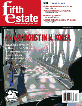 Join our friends at Fifth Estate for an informal launch of their new issue, where you can pick up a copy and meet some of the people involved. The issues theme is Mad! in all of its manifestations from crazy to wild, from Mad magazine to Mutually Assured Destruction (MAD), from surrealism to psychiatric oppression of anarchist youth.